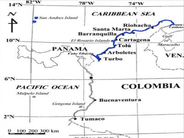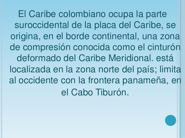 - 5. El Caribe colombiano ocupa la parte suroccidental de la placa del Caribe, seorigina, en el borde continental, una zonade compresión conocida como el cinturón deformado del Caribe Meridional. estálocalizada en la zona norte del país; limitaal occidente con la frontera panameña, en el Cabo Tiburón.