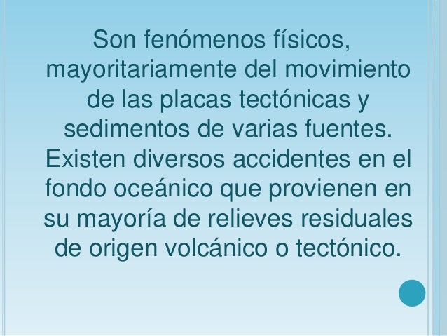 - 3. Son fenómenos físicos,mayoritariamente del movimiento de las placas tectónicas y sedimentos de varias fuentes.Existen diversos accidentes en elfondo oceánico que provienen ensu mayoría de relieves residuales de origen volcánico o tectónico.
