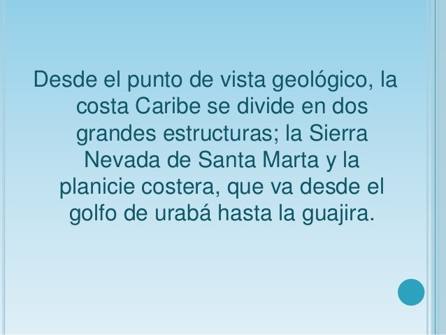 - 6. Desde el punto de vista geológico, la costa Caribe se divide en dos grandes estructuras; la Sierra Nevada de Santa Marta y la planicie costera, que va desde el golfo de urabá hasta la guajira.